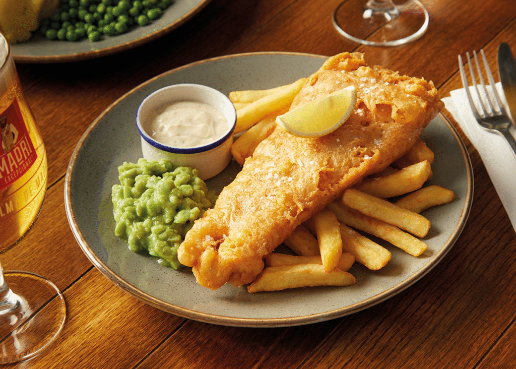 Hand-battered fish & chips, hand-battered fish fingers, served with chips and peas (†) | 4.79 712 kcals