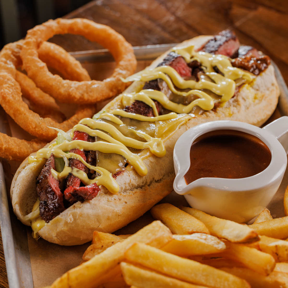 Ultimate steak dipper, steak, melted cheese and rich beef gravy in a crusty baguette, with crispy onion rings, chips and a pot of gravy for dipping | 14.79 1886 kcals
