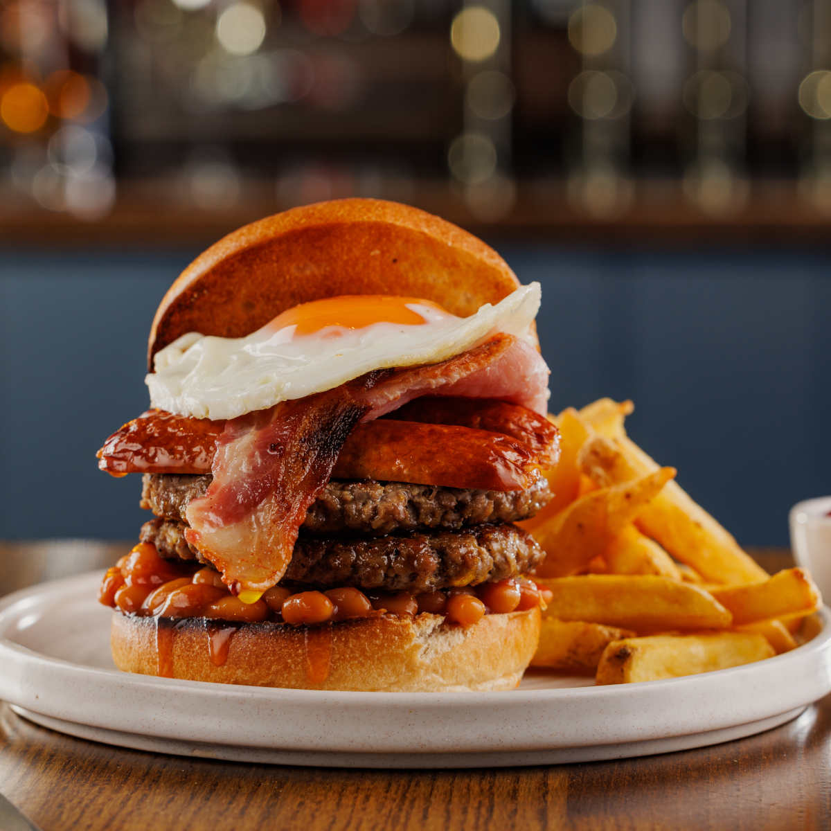 Big breakfast one, two 3oz beef patties, bacon, sausage, hash browns, free-range fried egg and baked beans | 14.79 2034 kcals
